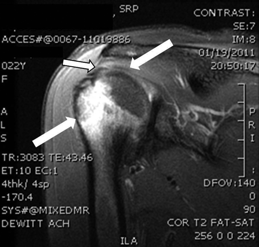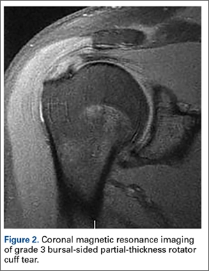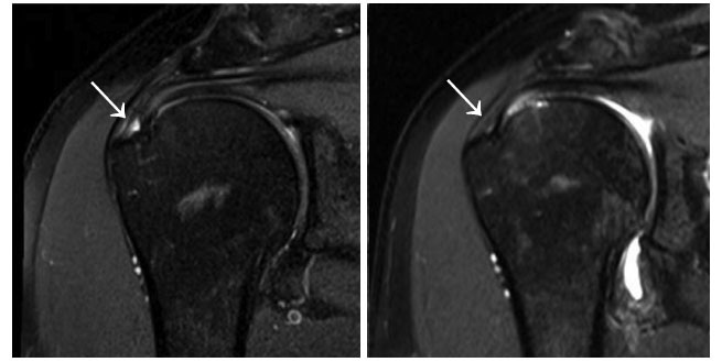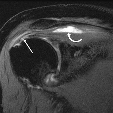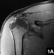 Figure 1: Rotator Cuff Tear This rotator cuff tear is seen in the The muscle is lit up in bright white and you can see a dark spot indicating the Figure 2: Partial Rupture This is a partial rupture of one of the rotator cuff The red arrow indicates the rupture Figure 3: Complete Rotator Cuff Tear